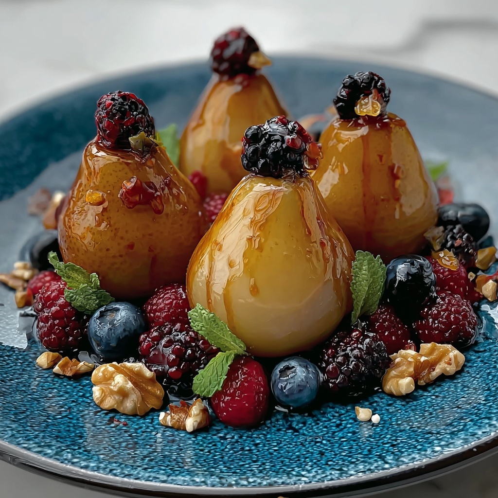 For a stunning presentation, arrange the pears on a rustic wooden board with clusters of fresh berries around them. Alternatively, place each pear half in a shallow white dish to let the colors pop, perfect for an intimate dinner or a festive gathering. For a brunch or light dessert, serve with a dollop of whipped mascarpone or Greek yogurt on the side to add creaminess without overpowering the dish.