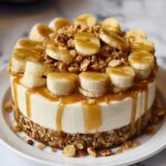 This Banana Pudding Crunch Cheesecake combines creamy, smooth cheesecake with the nostalgic flavors of banana pudding and crunchy layers of graham crackers and nuts. The rich cream cheese filling mingles with ripe mashed bananas and dry banana pudding mix to create a luscious, banana-infused dessert. A crunchy crust made from graham cracker crumbs, roasted peanuts, walnuts, sugar, and butter complements the creamy texture, while fresh banana slices and additional crushed nuts add a fresh and crunchy garnish. Perfect for dessert lovers seeking a unique twist on classic cheesecake.