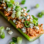 These Buffalo Chicken Celery Sticks are a delicious and healthy appetizer perfect for game days or casual gatherings. Tender shredded chicken is coated in a creamy, tangy buffalo sauce mixture, then chilled and served atop crisp celery sticks, garnished with blue cheese crumbles and fresh green onions for added flavor and crunch.
