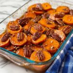 Transfer the coated sweet potatoes into a greased 9×13-inch baking dish. Pour any leftover syrup on top to keep it extra glossy and sticky. Sprinkle chopped pecans evenly over the surface for a gorgeous texture contrast and a hint of nutty flavor.