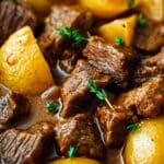 Stew meat, chuck roast cut into cubes, or other well-marbled cuts are perfect because they become wonderfully tender during the long simmer. Avoid lean cuts that might dry out.