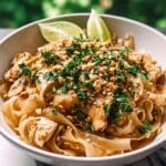 Garnishing your Chicken Pad Thai isn’t just for looks—it adds layers of texture and freshness that complete the dish. Use chopped peanuts for their satisfying crunch, fresh parsley for a pop of green and herbal brightness, and lime wedges to allow everyone to add a citrusy zing to their taste.