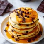 Deliciously fluffy chocolate chip pancakes made with a simple batter of flour, sugar, baking powder, and milk, studded with mini chocolate chips. Perfect for a kid-friendly, easy-to-make breakfast that can be customized to be dairy-free or vegan.