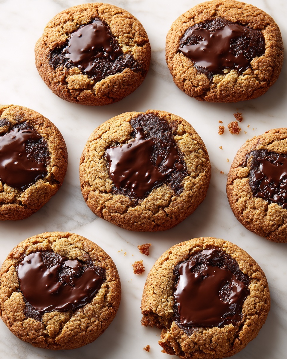 Delicious chocolate filled cookies featuring a tender, chewy dough encasing a gooey chocolate hazelnut center. These cookies combine the richness of butter and brown sugar with the deep flavor of espresso powder and semi-sweet chocolate chips, resulting in an indulgent treat perfect for any chocolate lover.
