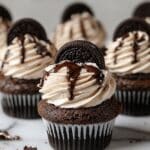 - Frost and Decorate: Frost the cooled cupcakes generously with the Oreo buttercream. Drizzle the chocolate ganache over the frosted cupcakes and top each with a mini Oreo cookie for garnish and added crunch.