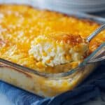 - Transfer and Top: Pour the creamy corn mixture into the prepared baking dish and evenly sprinkle the grated sharp cheddar cheese on top.