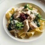 You can freeze this dish, but since it contains cream and fresh vegetables, it’s best to freeze it before adding the spinach. Cook the pasta, chicken, broccoli, and make the sauce, then freeze in portions. When ready to eat, thaw overnight in the fridge and add fresh spinach during reheating for the best texture and flavor.