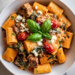 Creamy Sausage Rigatoni with Spinach Garlic and Tomato Cream Sauce is a hearty and flavorful pasta dish featuring Italian sausage simmered in a rich tomato cream sauce with fresh spinach and garlic. This comforting meal combines tender rigatoni pasta with a luscious blend of heavy cream, chicken broth, cherry tomatoes, and savory seasonings, finished with grated Parmesan cheese and fresh basil garnish.