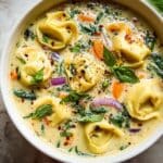 This creamy tortellini soup is a comforting and hearty dish perfect for any day. It features tender cheese tortellini simmered with vegetables in a flavorful broth enriched with heavy cream and fresh spinach, topped with Parmesan cheese and fresh basil for added richness and aroma.