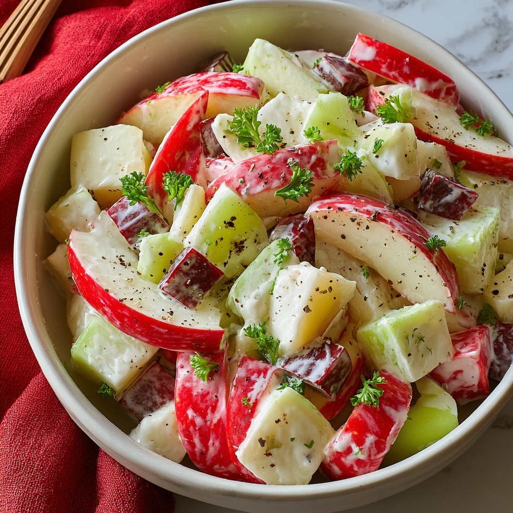 Start by placing the thinly sliced apples, chopped celery, diced red onion, toasted walnuts, and dried cranberries into a large mixing bowl. The key here is to work with fresh, crisp apples to give the salad its signature crunch that makes every forkful so satisfying.