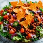 This salad doesn’t freeze well because the fresh veggies and chips will lose their texture. However, you can freeze the seasoned cooked beef separately for up to 2 months. Thaw it in the fridge overnight before adding it to fresh salad ingredients.