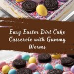 This Easter Dirt Cake Casserole is a fun and festive no-bake dessert featuring a chocolate cookie crumb crust, creamy vanilla pudding filling, and topped with gummy worms and sprinkles for a playful look perfect for Easter celebrations.