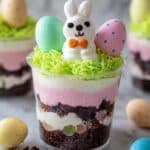 This playful and delightful Easter Dirt Cups recipe features layers of creamy colored vanilla pudding and crushed Oreo cookies that create a fun dirt effect. Topped with colorful shredded coconut and festive candy eggs and Peeps, these no-bake treats are perfect for Easter celebrations and springtime gatherings.