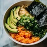 Top your rice and salmon medley with the sliced avocado and sprinkle with those bright green onions. This final touch adds creamy richness and fresh crunch. If you’re feeling adventurous, throw on some nori strips for an extra layer of flavor and texture. This bowl is now ready to devour!