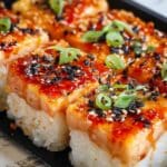- Bake the Sushi: Place the dish in the preheated oven and bake for 15-20 minutes until the topping is golden and bubbly, indicating it’s fully warmed through and lightly caramelized.