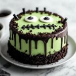 Celebrate Halloween with this fun and spooky Frankenstein Cheesecake that combines a rich chocolate cookie crust with a vibrant green cream cheese filling. Perfectly creamy and decorated with candy eyes and black gel icing to bring your holiday dessert table to life.