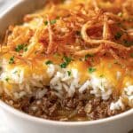 To elevate the French Onion Ground Beef and Rice Casserole Recipe further, fresh parsley adds a vibrant contrast against the rich and bubbly cheese crust. Don’t skip the crispy French fried onions—they bring a textural crunch that balances the softness of the casserole perfectly.