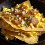 Break each fried tortilla into bite-sized pieces and divide them onto your serving plates. Top generously with the scrambled eggs and sautéed onions. This layering is what makes the Fried Corn Tortilla Scramble Recipe so addictive—the delicate scramble nestled on crunchy tortilla pieces topped with sweet onions.