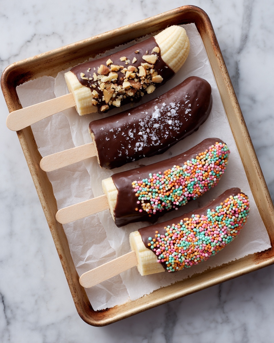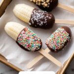 Before the chocolate sets, sprinkle or roll the bananas in your chosen toppings. Whether it’s crunchy peanuts, flaky coconut, or colorful sprinkles, this step adds both texture and personality. Lay the coated bananas back on the parchment-lined sheet and freeze them again for at least 30 minutes so the chocolate hardens completely. Now they are ready to enjoy whenever you want!