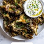 Delicious grilled artichokes marinated in a zesty mixture of olive oil, lemon juice, and garlic, served with a creamy garlic aioli dip. Perfect as a flavorful appetizer or side dish, this recipe highlights tender artichokes with smoky grill marks and a rich, garlicky accompaniment.