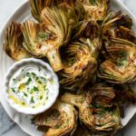 Delicious grilled artichokes marinated in a zesty mixture of olive oil, lemon juice, and garlic, served with a creamy garlic aioli dip. Perfect as a flavorful appetizer or side dish, this recipe highlights tender artichokes with smoky grill marks and a rich, garlicky accompaniment.