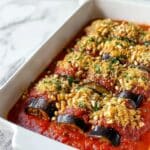 Pour the rich tomato sauce evenly over the eggplant rolls. Cover the dish with foil and bake in a preheated 375°F (190°C) oven for 30 minutes to meld the flavors. Meanwhile, coarsely chop parsley, pine nuts, Pecorino Romano, and breadcrumbs, then rub in the optional anchovy or anchovy paste for a savory punch. Remove the foil, sprinkle this crunchy topping over the rolls, and bake uncovered for another 15 minutes until golden. For an extra touch, broil a few minutes to achieve a perfectly browned crust.