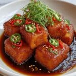 Korean Braised Tofu is a flavorful vegetarian dish featuring firm tofu slices pan-fried until golden and then simmered in a savory, spicy sauce made with gochugaru, gochujang, soy sauce, and garlic. This quick and easy recipe offers a perfect balance of heat, umami, and subtle sweetness, garnished with green onions and toasted sesame seeds, ideal as a side dish or served over steamed rice.