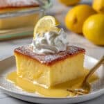 - Cool and serve: Allow the cake to cool in the dish for about 30 minutes. Before serving, dust the top lightly with powdered sugar, add a dollop of whipped cream, garnish with fresh mint sprigs, and lemon slices for an attractive presentation. Enjoy this refreshing lemon dessert!