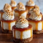 9. Serve: Just before serving, top each mini cheesecake with a small dollop of dulce de leche and a swirl of whipped cream if desired. Optionally, sprinkle with sea salt or crushed toffee bits for added flavor and crunch.