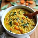 A hearty and flavorful one-pot golden lentil soup made with red lentils, fresh turmeric, ginger, and warming spices. This comforting vegan soup combines sautéed vegetables with creamy coconut milk and bright lemon juice for a nutritious and satisfying meal.