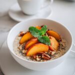 For a fresh, verdant contrast, add a few tender mint leaves as a garnish if you like. Serve your Peaches & Cream Oatmeal Recipe warm and savor the comforting medley of creamy, fruity, and nutty flavors.
