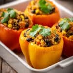 Quinoa Stuffed Bell Peppers are a nutritious and delicious meal featuring bell peppers filled with a flavorful mixture of quinoa, black beans, tomatoes, and spices, topped with melted cheese. Perfect as a wholesome vegetarian entree, this recipe is easy to prepare and packed with protein and fiber.