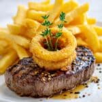 This Ribeye Steak with French Onions and French Fries recipe delivers a classic, mouth-watering steak dinner with a rich caramelized onion topping and crispy fries on the side. Perfectly seared ribeye steak is enhanced with sweet, golden-brown sautéed onions and served alongside golden, crunchy French fries for a satisfying, indulgent meal.