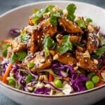 This vibrant Sesame Chicken Cabbage Crunch Salad is a refreshing and healthy dish featuring tender cooked chicken breast tossed with shredded green and red cabbage, crisp carrots, red bell pepper, green onions, cilantro, and crunchy nuts. It’s dressed with a zesty homemade sesame dressing combining rice vinegar, soy sauce, toasted sesame oil, olive oil, honey, ginger, garlic, and lime juice. Perfect as a light meal or a nutritious lunch, this Asian-inspired gluten-free salad is quick to prepare with no cooking required.