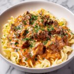 For a twist, serve your Slow Cooker Beef Stroganoff Recipe in hollowed-out bread bowls for a fun, rustic presentation. You can also pile it atop baked potatoes for a heartier option or spoon it over cauliflower rice for a low-carb variation that still delights your taste buds.