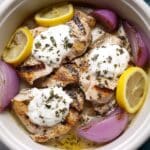 You can freeze the cooked chicken and juices in a freezer-safe container for up to 3 months. When you want to enjoy the Slow Cooker Chicken Gyros Recipe again, thaw it overnight in the refrigerator before reheating.