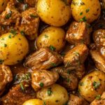 Reheat leftovers gently on the stovetop over medium-low heat so the beef stays tender and the potatoes don’t dry out. Alternatively, microwave in short bursts, stirring occasionally, until warmed through. Adding a splash of beef broth or a small pat of butter while reheating can revive the dish’s luscious texture and flavor.