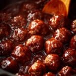 Cover your slow cooker and set it on low for 6 hours. During this time, the meatballs heat through, and the flavors meld beautifully while the sauce thickens naturally into a rich gravy that coats every morsel.