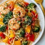 This dish isn’t ideal for freezing because the texture of the shrimp and vegetables can suffer once thawed. However, you can freeze leftover plain cooked pasta separately for best results and combine it with fresh sauce and shrimp later when ready to eat.