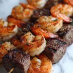 - Grill the Kabobs: Place the assembled kabobs on the preheated grill. Cook for 8 to 10 minutes, turning occasionally to char all sides evenly, until the steak reaches a medium doneness and the shrimp turn opaque with slight charring.
