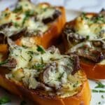 Steak Garlic Bread is a savory and satisfying dish featuring tender slices of cooked steak layered over garlic butter-spread toasted bread, topped with a blend of melted mozzarella and provolone cheeses. Perfect as a hearty appetizer or a main course, this recipe combines the rich flavors of garlic, beef, and melted cheese on a crisp baguette.