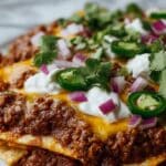 - Add Cheese and Jalapeños: Sprinkle shredded cheddar and mozzarella cheeses evenly over the beef and chips. If using, scatter sliced pickled jalapeños on top for a spicy kick.