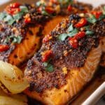 Sweet Sumac Salmon is a vibrant and flavorful dish featuring tender salmon fillets coated with a zesty spice paste made from sumac, smoked paprika, and garlic powder. Roasted to perfection in the oven, this recipe delivers a beautifully flaky, aromatic, and colorful main course that’s perfect for a quick weeknight dinner or a special occasion.