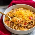 - Combine Pasta: Add the cooked pasta to the skillet with the meat sauce. Stir well to coat the pasta evenly.