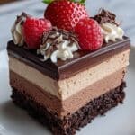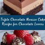This decadent Triple Chocolate Mousse Cake features three layers of luscious dark, milk, and white chocolate mousse layered over a moist cocoa cake base. Perfect for chocolate lovers, this elegant dessert combines rich flavors and creamy textures, topped with fresh berries and shaved chocolate for a stunning presentation.