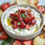 This Whipped Feta Dip with Roasted Strawberries combines creamy whipped feta cheese blended with cream cheese, olive oil, honey, and lemon zest, topped with juicy roasted strawberries drizzled with balsamic vinegar and sugar. It’s a perfect savory and sweet appetizer served with crackers or toasted baguette slices, ideal for entertaining or a delicious snack.